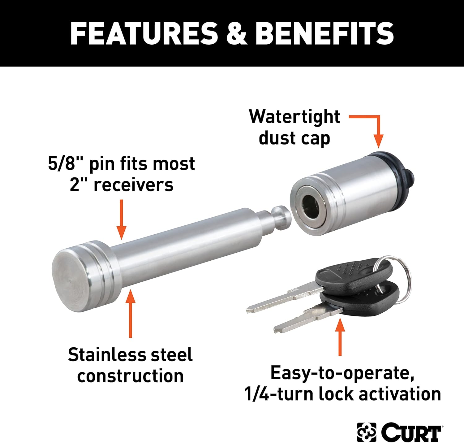 Make your tow vehicle and trailer more secure by keeping them locked up tight with a CURT hitch lock. Like a hitch pin and clip, a hitch lock is designed to insert into the fastener hole in the side of a receiver tube in order to hold a ball mount or hitch-mounted accessory in place. While a CURT hitch pin does offer sufficient strength for keeping your ball mount firmly attached, a CURT hitch lock goes one step further. CURT hitch locks allow you to lock your ball mount into your trailer hitch, deterring theft and preventing anyone from detaching your trailer at the ball mount and towing away your property without your permission. This CURT hitch lock features a barbell design and comes with a 5/8" pin diameter to fit a 2" receiver tube size. CURT barbell hitch locks are comprised of a pin with two end caps and a round locking mechanism. They are key-operated and activate with a simple 1/4-turn. They also come with a watertight dust cap to keep out the elements and prevent corrosion. For the ultimate in towing security, a hitch lock and coupler lock used together will provide security at both the vehicle-side and trailer-side of your towing setup. For your boat, ATV or camper, keep your toys more secure with CURT hitch locks.